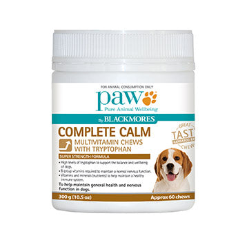PAW Blackmores Complete Calm Chews are formulated with tryptophan, B vitamins and a blend of multivitamins and nutrients to support the general health and nervous function of dogs.