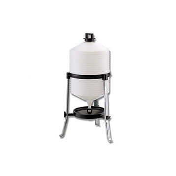 Gravity fed ground level automatic drinker. 30 litre tank on tripod. Wide stable legs with nail down points for outdoor use. Easy to fill from the top cap with garden hose. Bung to stop water flow when refilling upright.